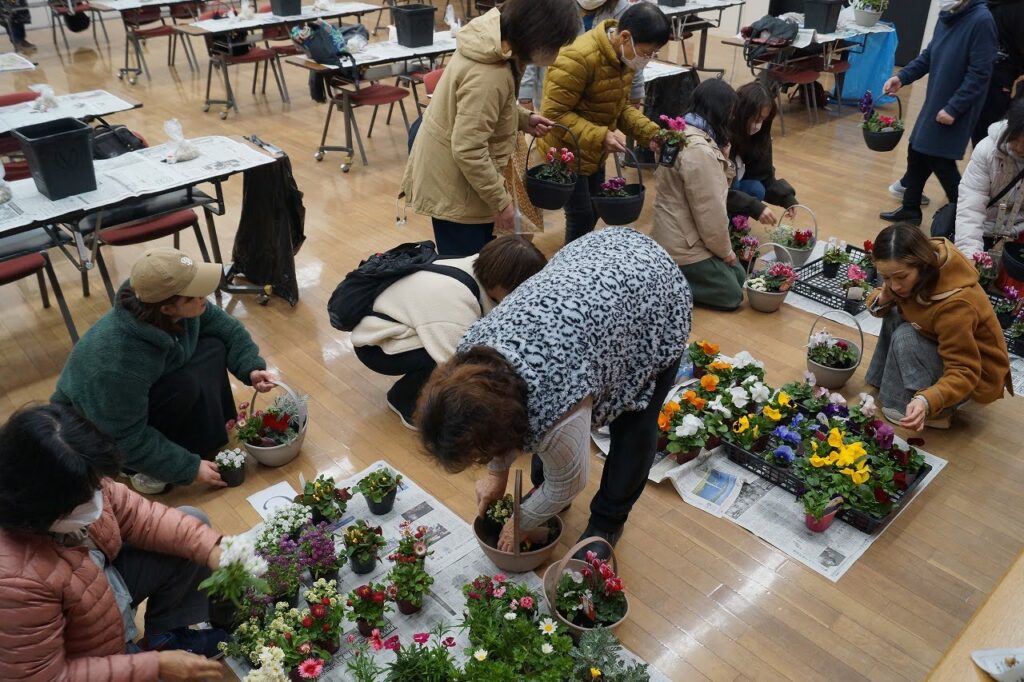 参加者の皆さんはどのようなレイアウトにしようかと考えながら植え込む草花を選んでいきます。
