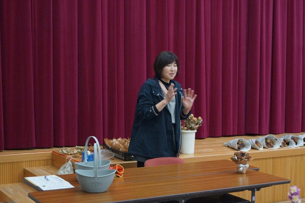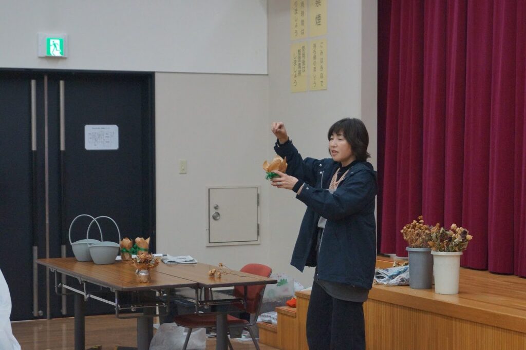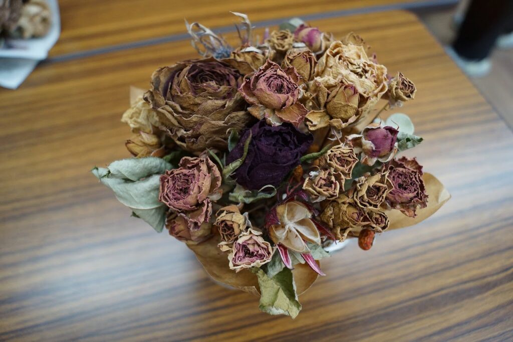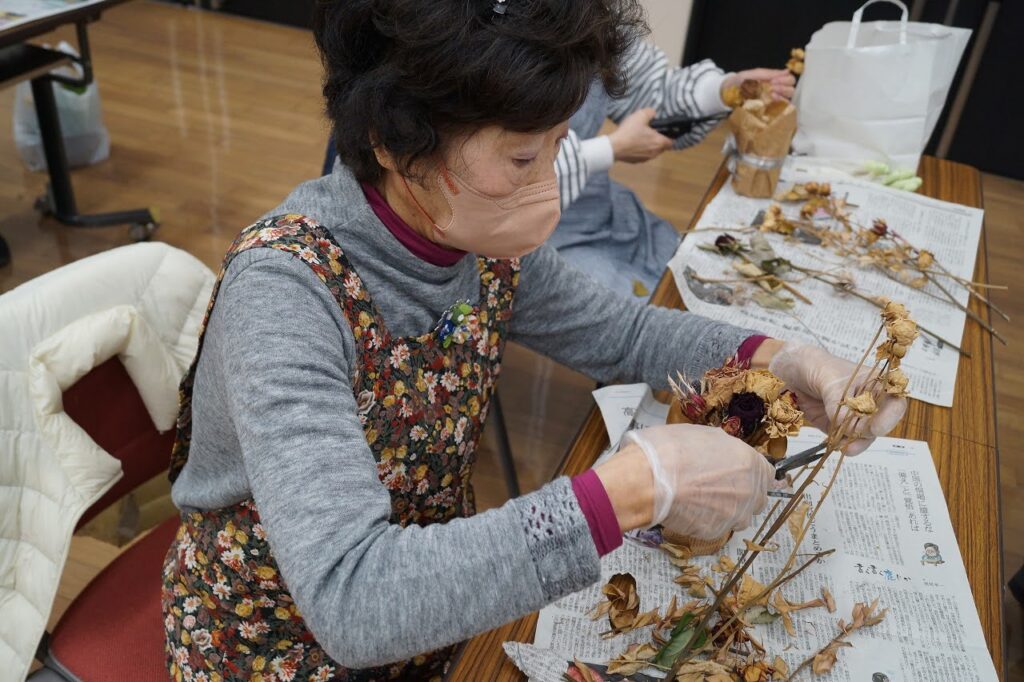 寄せ植えがひと段落すると、次にドライフラワーを使ったアレンジメントの作成です。