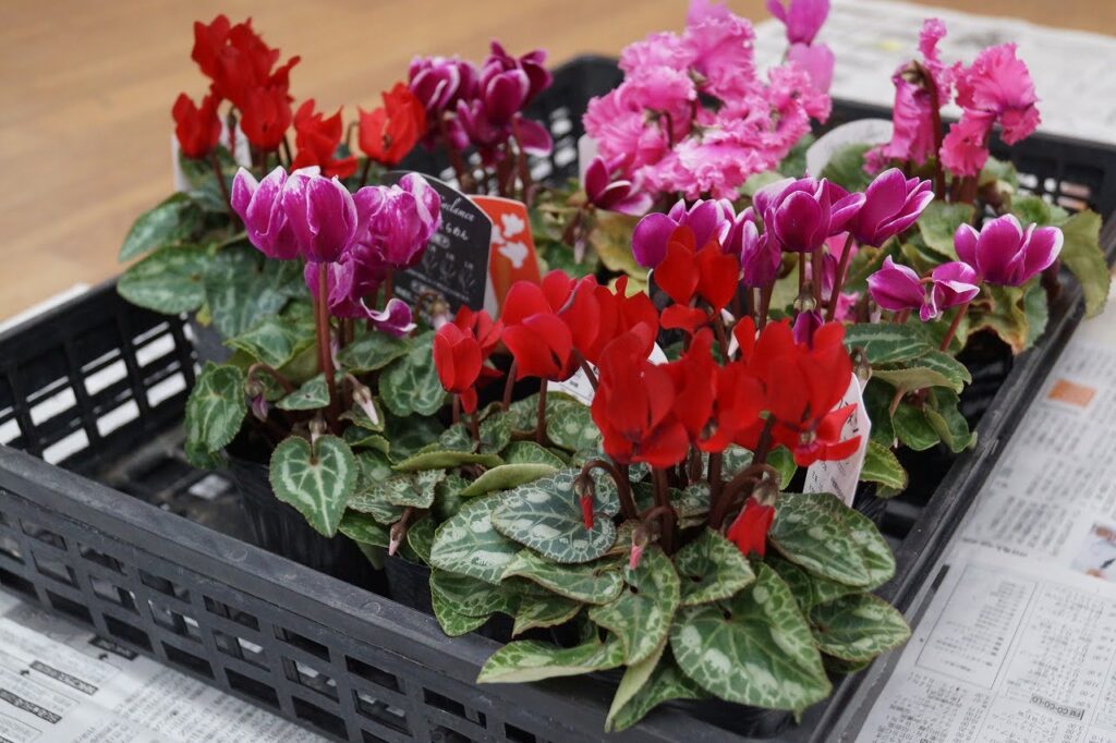 今年は持ち手のついた籠のような形の植木鉢にシクラメンや葉牡丹をはじめとする草花を各々選んで寄せ植えを仕立てました。