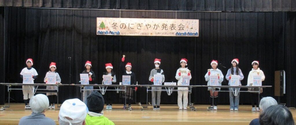 小2~6年生までの10人の子どもたちが参加して、11/26(水)~12/12(金)にかけて練習4日間、12/14(日)のにぎやか発表会で演奏を披露しました。
