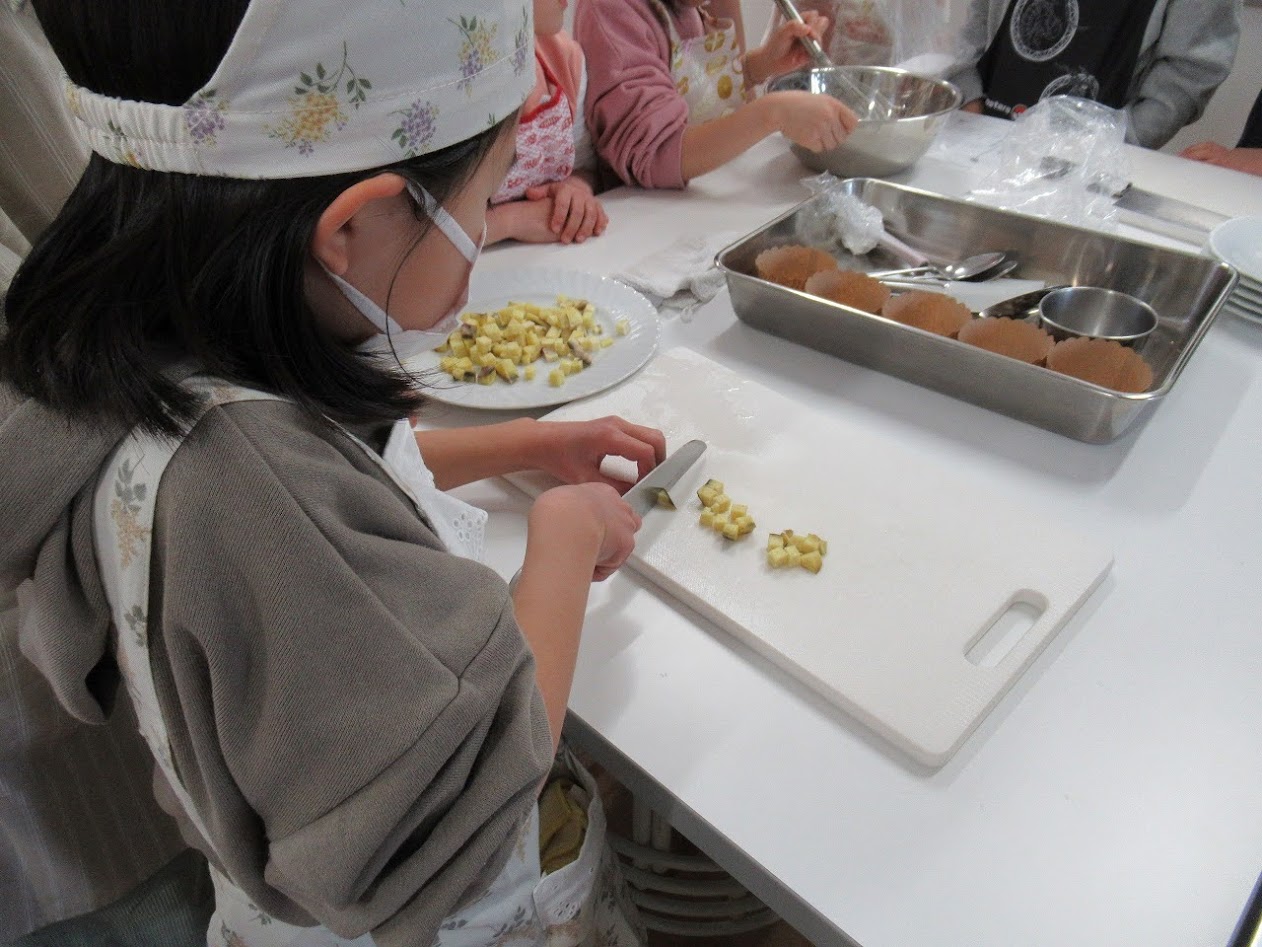 1・2年生のさつまいも蒸しケーキでは、さつまいもをサイコロ状に切るのですが、サツマイモが固いため少しレンジをかけて柔らかくしてから包丁で切っていきました。