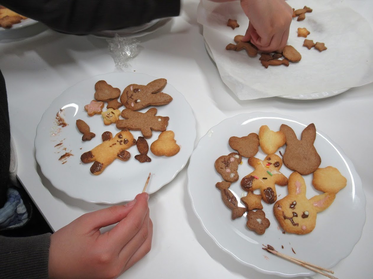 3・4年生は今年も型抜きクッキー。ココア生地とプレーンの2種類で、焼きあがった後に溶かしたチョコなどでデコレーションをしました。いろいろな作品ができてとても楽しそうでした。